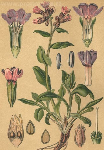 Sbíraná část: kvetoucí nať (Herba pulmonariae), list (Folium pulmonariae)